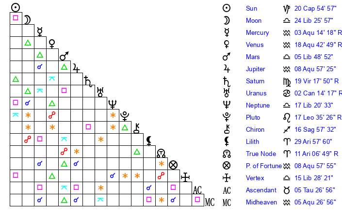| Moon | 24 Libra 26 | 23 Gemini 27 | 16 Cancer 22 |