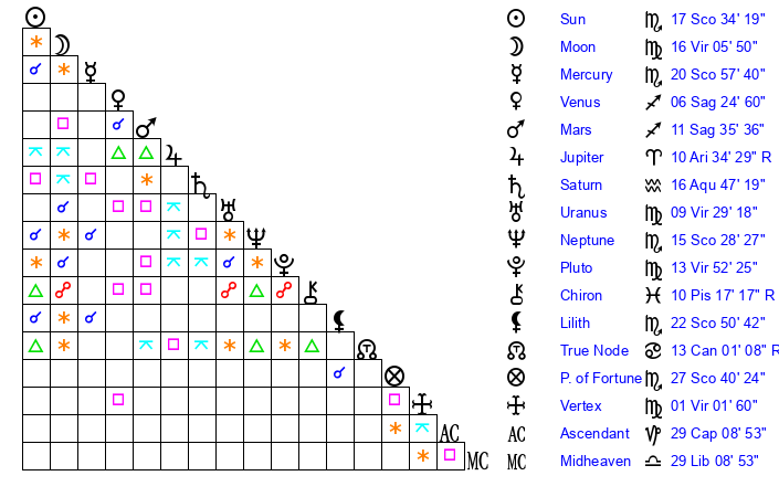 | Neptune | 15 Scorpio 28 | 29 Pisces 36 | 17 Scorpio 25 |