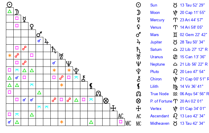 | Venus | 14 Aries 58 | 2 Aries 21 | 8 Gemini 41 |