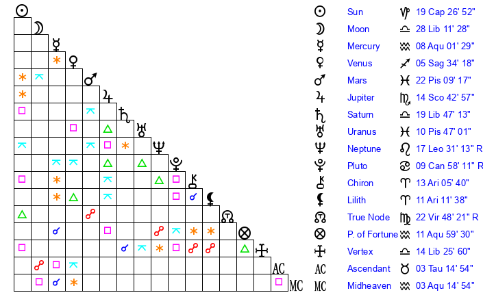 | Moon | 28 Libra 10 | 20 Libra 58 | 26 Cancer 14 |