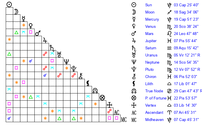 | Mercury | 19 Capricorn 52 | 12 Sagittarius 27 | 12 Aquarius 48 |