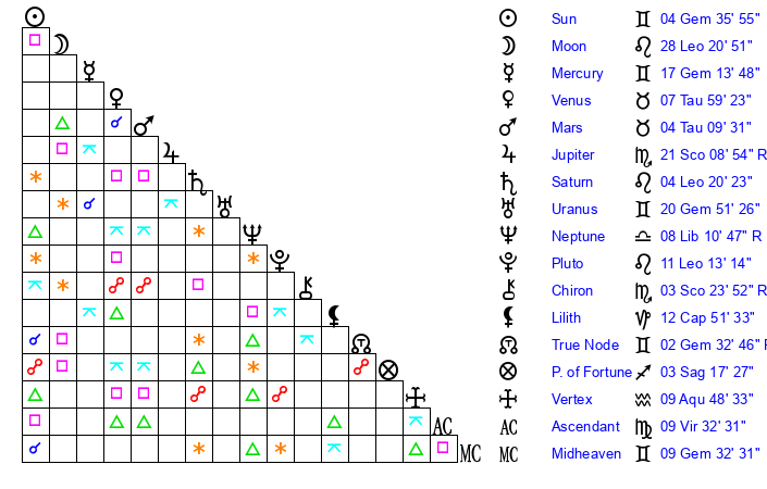 | Moon | 28 Leo 28 | 29 Taurus 50 | 26 Gemini 25 |
