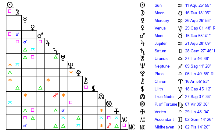 | Sun | 11 Aquarius 27 | 12 Aquarius 4 | 2 Aries 41 |