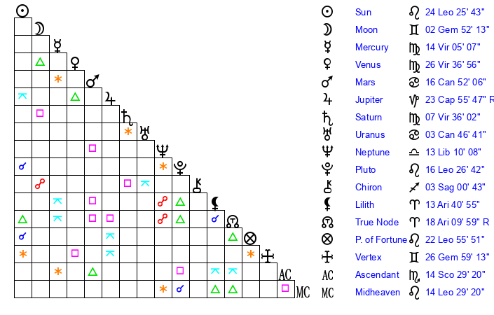 | Moon | 2 Gemini 43 | 14 Gemini 37 | 23 Pisces 51 |