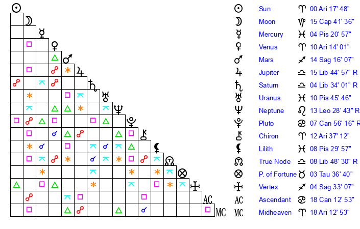 | Sun | 0 Aries 18 | 1 Aries 20 | 10 Cancer 0 |