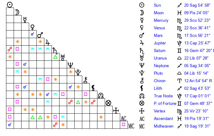 | Neptune | 5 Sagittarius 33 | 29 Pisces 22 | 7 Sagittarius 6 |