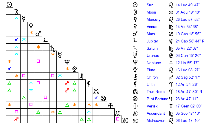 | Pluto | 16 Leo 8 | 2 Aquarius 15 | 18 Leo 0 |
