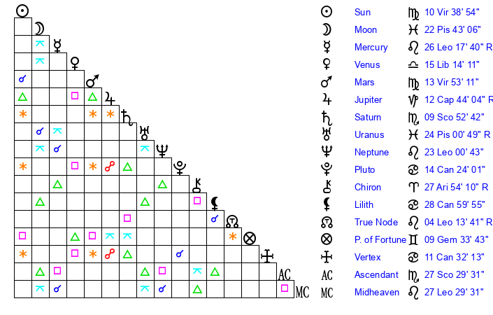 | Mercury | 26 Leo 18 | 2 Virgo 12 | 17 Sagittarius 42 |