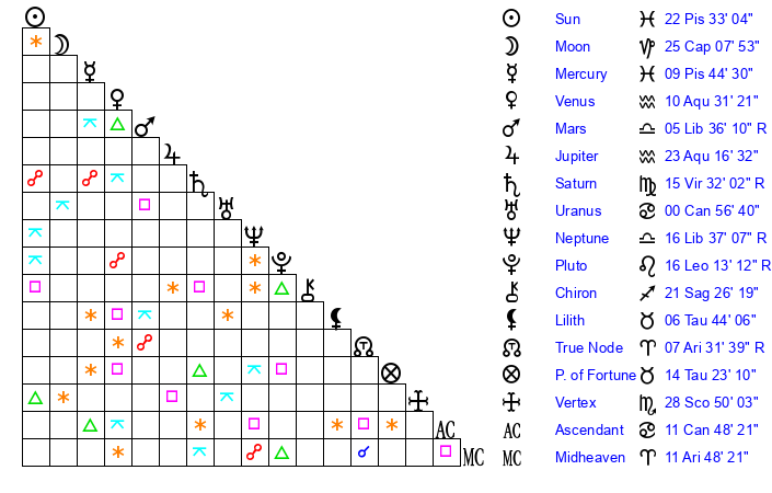 | Saturn | 16 Virgo 6 | 22 Pisces 11 | 13 Virgo 14 |