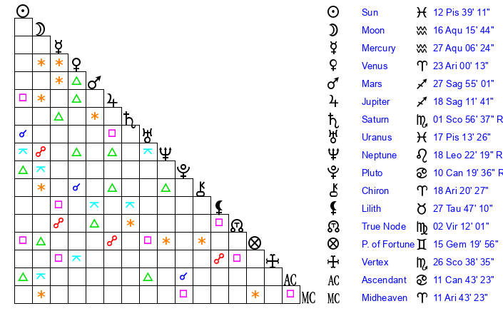 | Sun | 12 Pisces 39 | 13 Pisces 9 | 21 Gemini 13 |