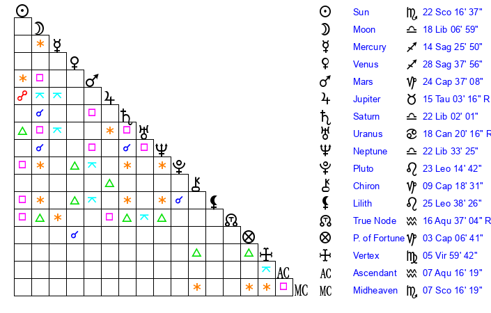 | Neptune | 22 Libra 33 | 27 Pisces 16 | 23 Libra 53 |