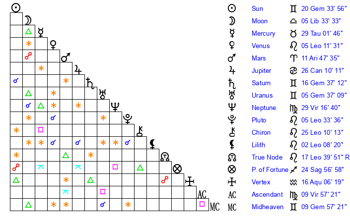 | Sun | 20 Gemini 34 | 21 Gemini 42 | 9 Virgo 4 |
