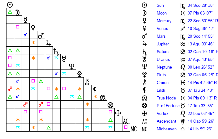 | Neptune | 0 Leo 27 | 29 Pisces 50 | 28 Cancer 19 |