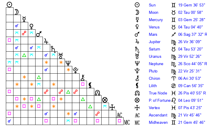 | Moon | 1 Taurus 54 | 13 Sagittarius 11 | 20 Taurus 29 |