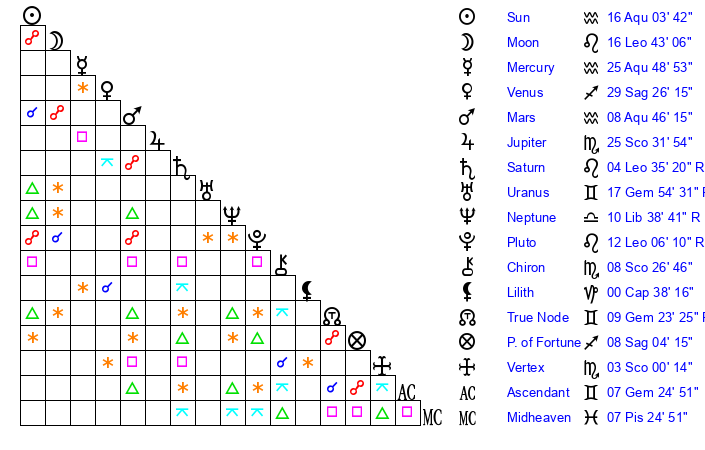 | Pluto | 12 Leo 5 | 2 Aquarius 12 | 10 Leo 58 |