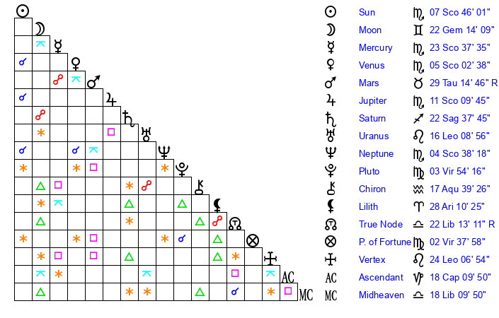 | Sun | 7 Scorpio 46 | 8 Scorpio 31 | 15 Capricorn 38 |