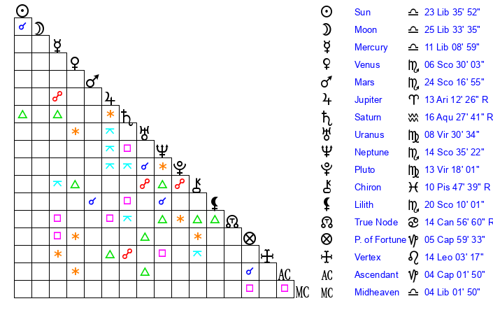 | Sun | 23 Libra 36 | 24 Libra 34 | 26 Sagittarius 3 |