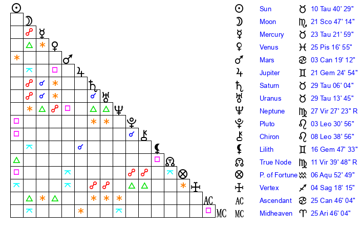 Saturn | 29 Taurus 20 | 27 Pisces 50 | 9 Gemini 25 |