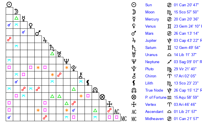 | Mercury | 20 Cancer 20 | 24 Cancer 17 | 11 Leo 3 |