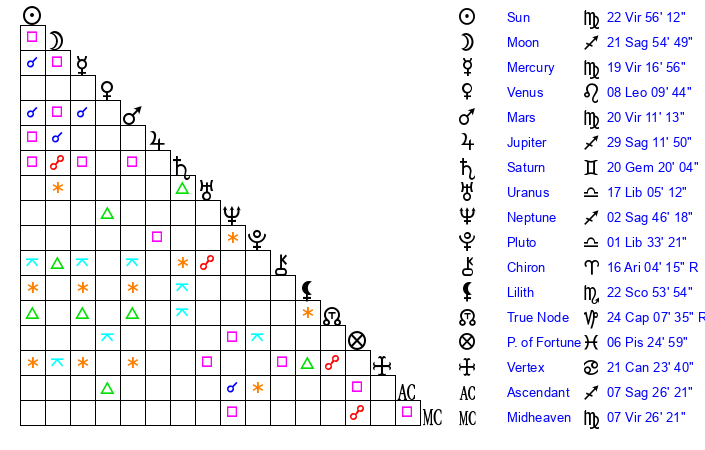 | Mercury | 19 Virgo 17 | 25 Virgo 5 | 8 Sagittarius 25 |