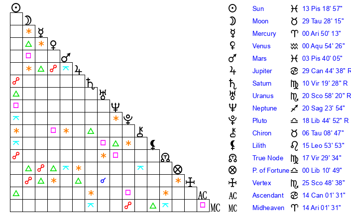 | Moon | 29 Taurus 31 | 15 Taurus 20 | 25 Capricorn 18 |