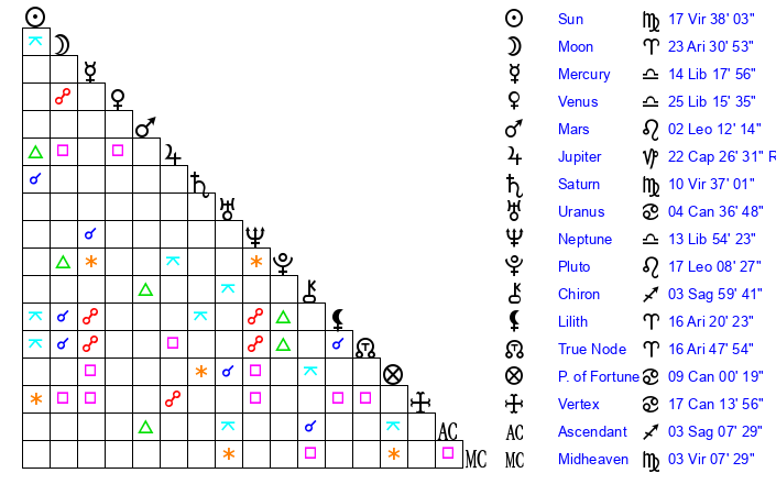 | Sun | 17 Virgo 38 | 18 Virgo 14 | 3 Sagittarius 6 |