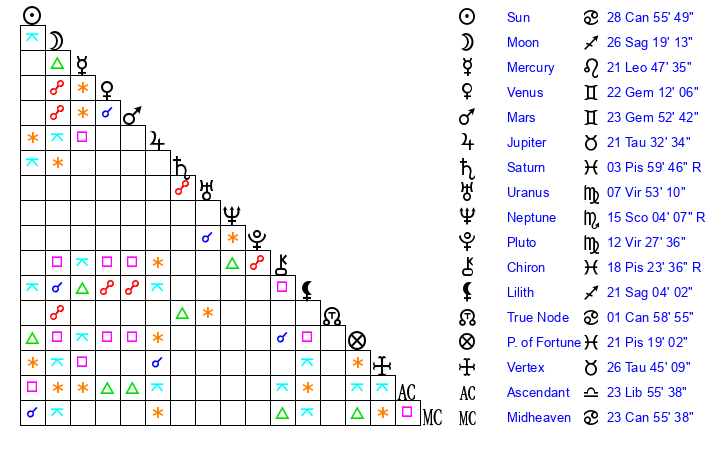 | Moon | 26 Sagittarius 23 | 18 Gemini 17 | 15 Pisces 3 |