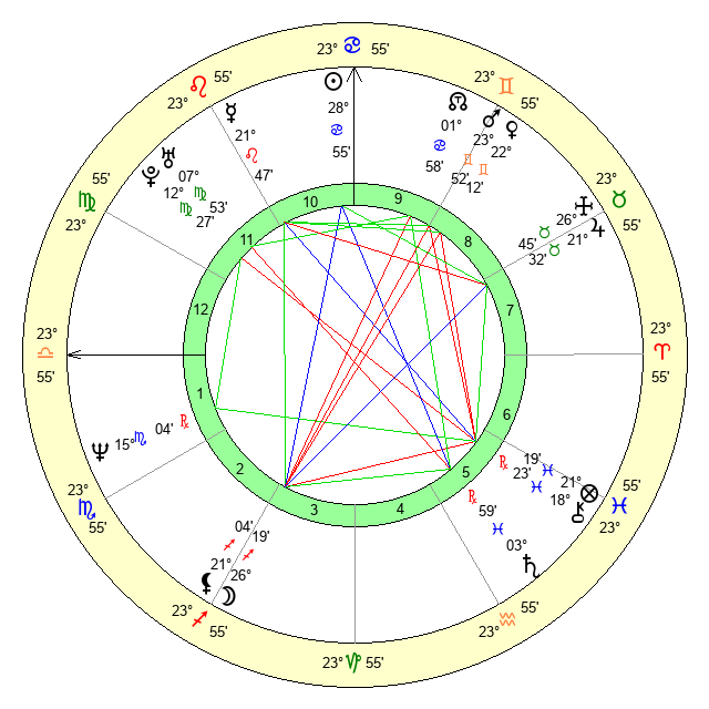 | Sun | 28 Cancer 56 | 29 Cancer 11 | 27 Virgo 45 |