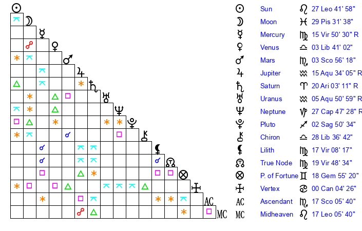 | Mercury | 15 Virgo 50 | 9 Leo 26 | 7 Virgo 0 |