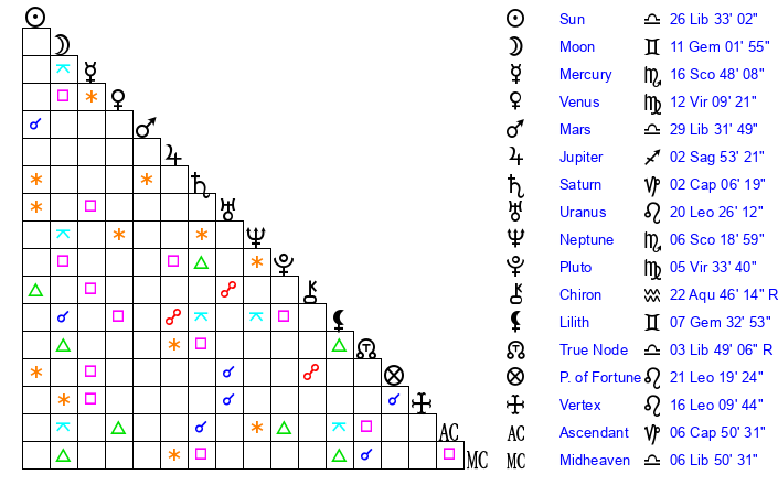 | Moon | 11 Gemini 3 | 18 Libra 34 | 6 Scorpio 4 |