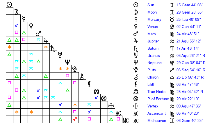 Sun | 15 Gemini 44 | 15 Gemini 57 | 12 Cancer 28 |