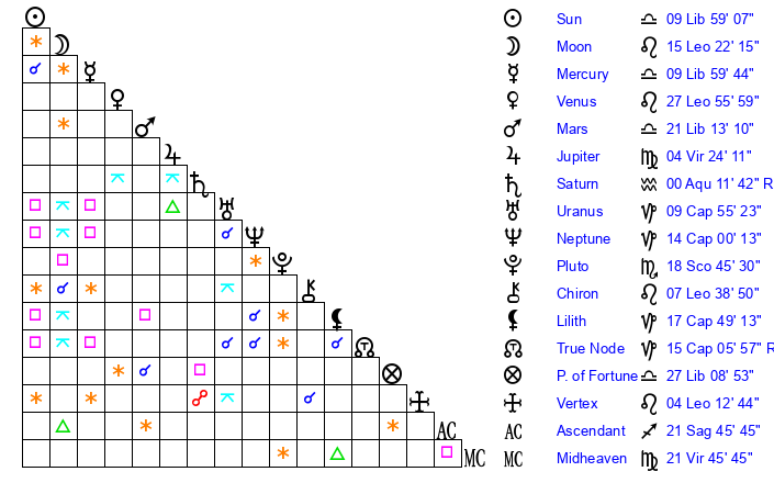 | Moon | 15 Leo 18 | 24 Aquarius 48 | 16 Scorpio 33 |