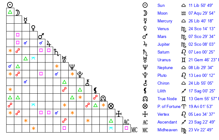 | Mercury | 26 Libra 41 | 28 Libra 30 | 14 Sagittarius 32 |
