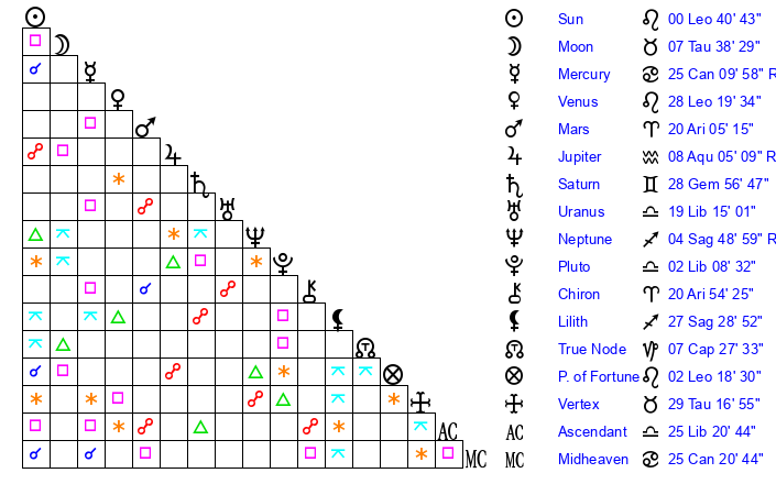 | Sun | 0 Leo 40 | 1 Leo 5 | 20 Virgo 45 |
