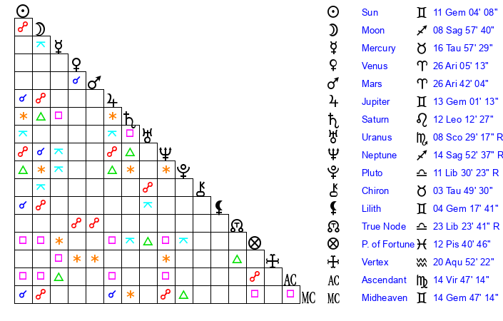 | Neptune | 14 Sagittarius 52 | 1 Aries 52 | 13 Sagittarius 42 |