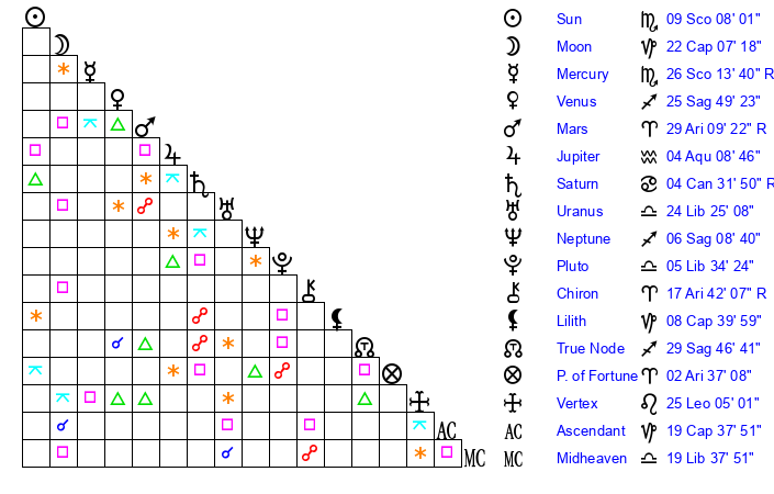 | Moon | 22 Capricorn 9 | 16 Pisces 41 | 21 Sagittarius 41 |