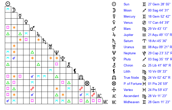 | Sun | 27 Gemini 29 | 27 Gemini 42 | 24 Cancer 11 |