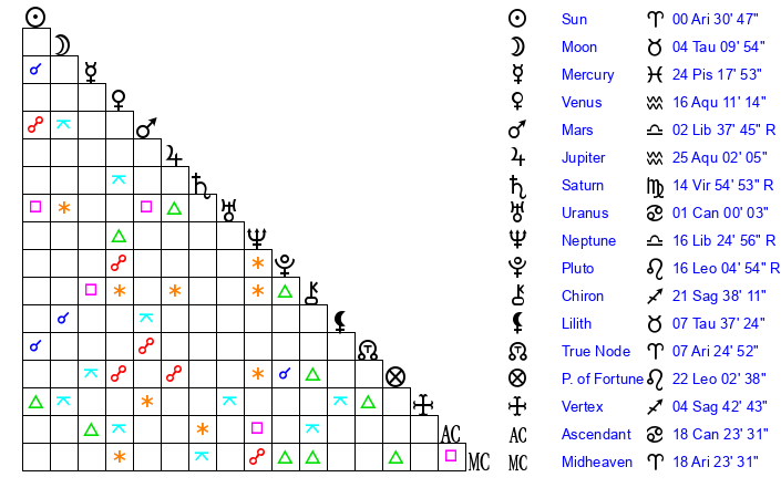 | Neptune | 16 Libra 24 | 29 Pisces 40 | 14 Libra 41 |