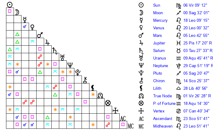 | Mercury | 18 Leo 9 | 22 Leo 50 | 2 Libra 20 |