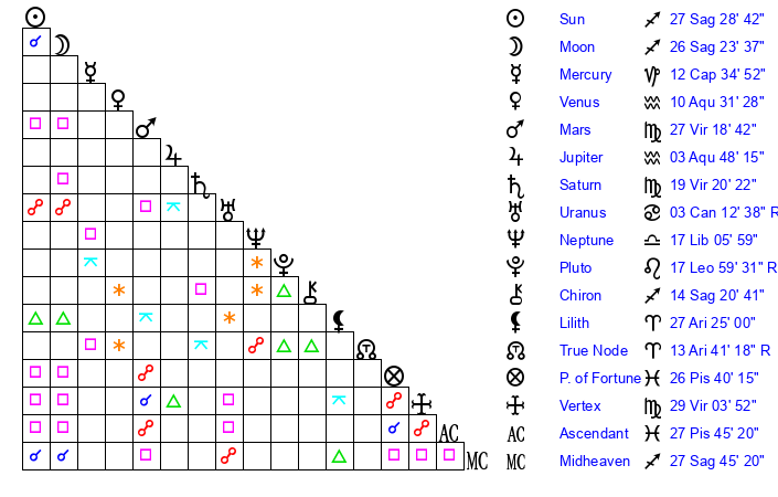 | Sun | 27 Sagittarius 29 | 28 Sagittarius 2 | 14 Pisces 33 |