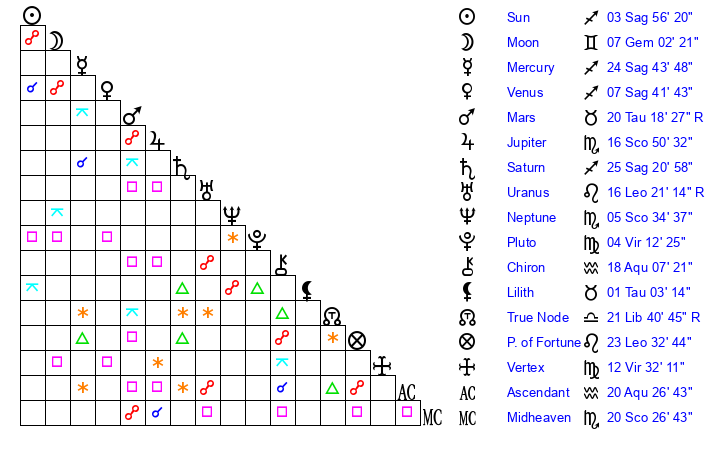 | Mars | 20 Taurus 20 | 16 Sagittarius 7 | 26 Taurus 21 |