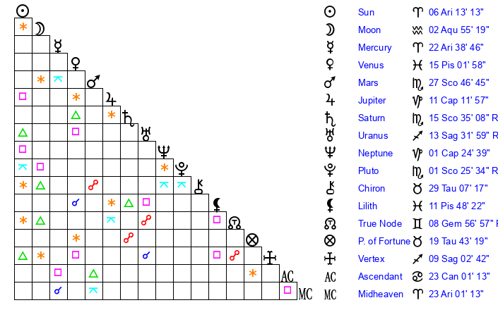 | Saturn | 15 Scorpio 56 | 23 Pisces 46 | 13 Scorpio 11 |