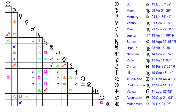 | Neptune | 14 Scorpio 26 | 0 Aries 12 | 16 Scorpio 41 |