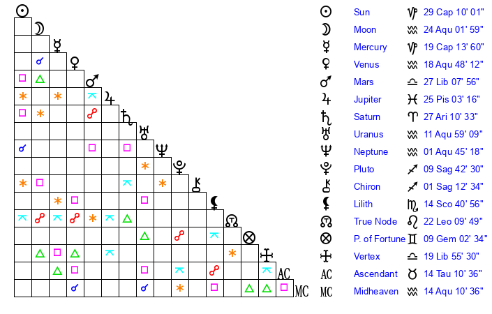 | Moon | 24 Aquarius 3 | 6 Libra 37 | 6 Aquarius 2 |