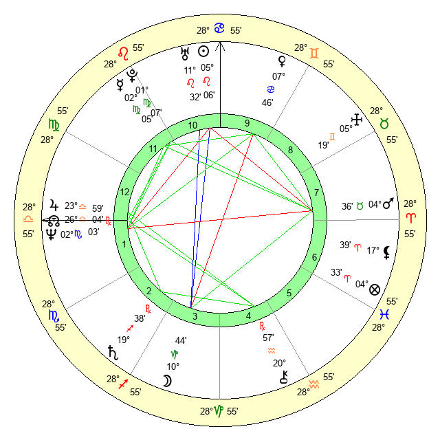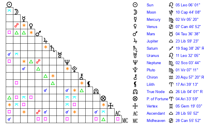 | Moon | 10 Capricorn 38 | 23 Virgo 28 | 13 Gemini 2 |