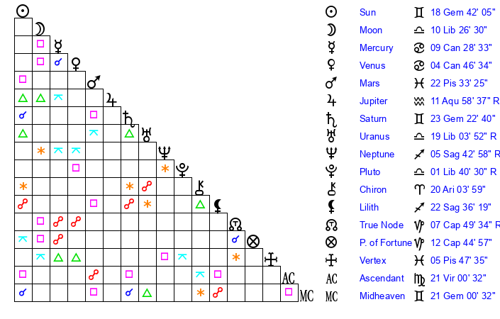 | Moon | 10 Libra 32 | 1 Sagittarius 2 | 4 Virgo 28 |