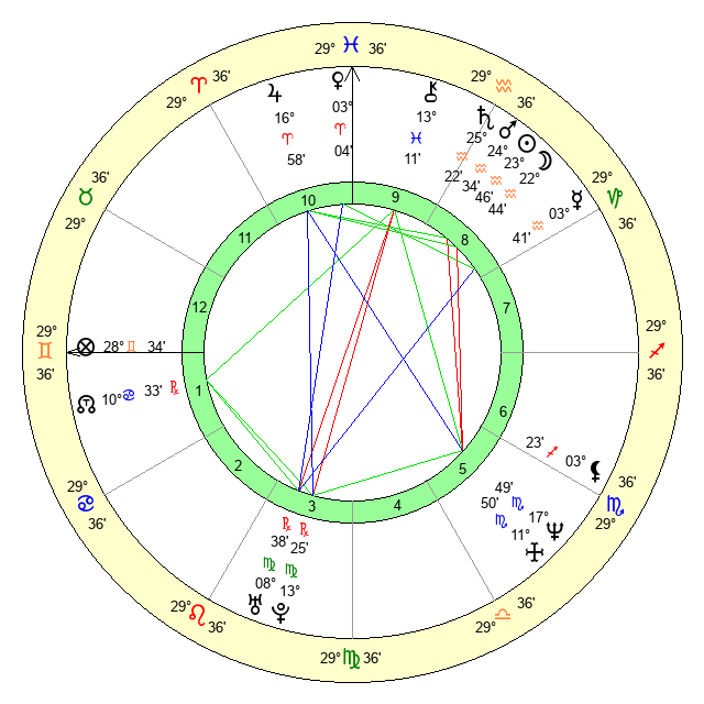 | Moon | 22 Aquarius 47 | 5 Virgo 2 | 21 Taurus 13 |