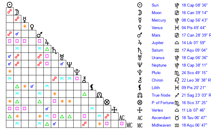 Uranus | 18 Capricorn 8 | 23 Taurus 29 | 19 Capricorn 58 |
