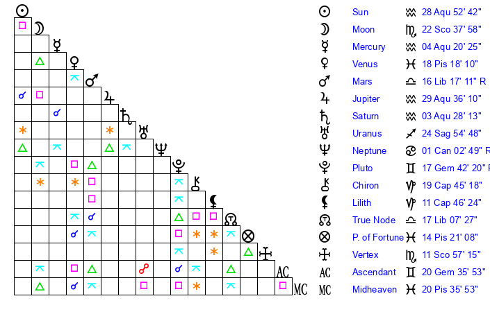 | Sun | 28 Aquarius 53 | 0 Pisces 17 | 28 Gemini 10 |
