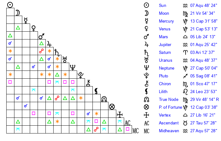 | Sun | 7 Aquarius 48 | 8 Aquarius 1 | 6 Pisces 8 |
